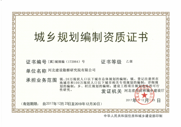經(jīng)過(guò)艱苦努力,我公司于2017年12月25日取得了城鄉(xiāng)規(guī)劃編制乙級(jí)資質(zhì)證書,可承擔(dān)20萬(wàn)現(xiàn)狀人口以下城市總體規(guī)劃的編制,登記注冊(cè)所在地城市和100萬(wàn)現(xiàn)狀人口以下城市相關(guān)專項(xiàng)規(guī)劃的編制,以及建設(shè)工程項(xiàng)目規(guī)劃選址的可行性研究。
