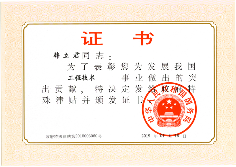 公司董事長韓立君入選國務院政府特殊津貼專家