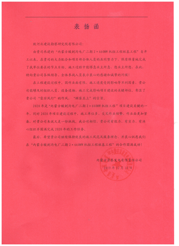 近日,由我公司承建的內(nèi)蒙古酸刺溝二期2×660WM機(jī)組工程樁基工程收到甲方內(nèi)蒙古京泰發(fā)電有限公司的表揚(yáng)信,對項(xiàng)目部全體員工的辛勤付出,給予了高度認(rèn)可和評價(jià),并為后續(xù)雙方的合作奠定了良好基礎(chǔ)。這充分彰顯了河北建勘人“雷厲風(fēng)行”的作風(fēng),“顧客至上”的宗旨。我們將繼續(xù)保持我們的施工風(fēng)范和服務(wù)理念,再接再厲,圓滿完成后續(xù)施工任務(wù)!