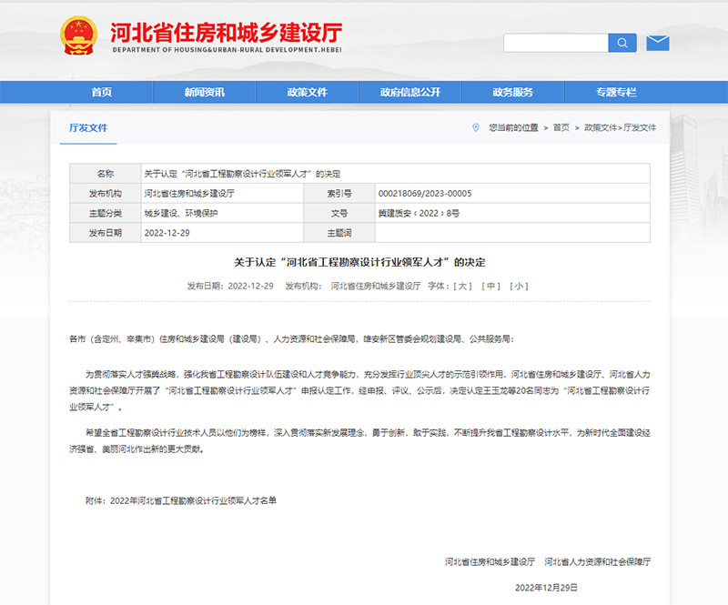 為貫徹落實(shí)人才強(qiáng)冀戰(zhàn)略,強(qiáng)化我省工程勘察設(shè)計(jì)隊(duì)伍建設(shè)和人才競(jìng)爭(zhēng)能力,充分發(fā)揮行業(yè)頂尖人才的示范引領(lǐng)作用,近日,河北省住房和城鄉(xiāng)建設(shè)廳、河北省人力資源和社會(huì)保障廳聯(lián)合印發(fā)《關(guān)于認(rèn)定“河北省工程勘察設(shè)計(jì)行業(yè)領(lǐng)軍人才”的決定》,我公司梁書(shū)奇同志被認(rèn)定為“河北省工程勘察設(shè)計(jì)行業(yè)領(lǐng)軍人才”。