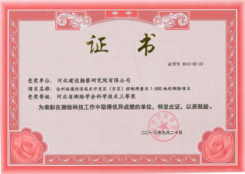 近日,由工程測量公司完成的滄州臨港經(jīng)濟(jì)技術(shù)開發(fā)區(qū)(東區(qū))控制測量及1:500地形測繪項(xiàng)目,被河北省測繪學(xué)會(huì)評為河北省測繪學(xué)會(huì)科學(xué)技術(shù)三等獎(jiǎng)。
