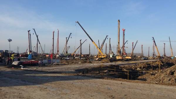 本工程主要特點為“短、平、快”。工期緊,任務重,施工場地狹小,投入機械設備和人員眾多。高峰期投入旋挖鉆機40臺、潛水鉆6臺、鏟車42臺、挖掘機7臺、吊車44臺、HZS120型攪拌站一套、35型攪拌站一套、90攪拌站一臺套、罐車31臺,項目施工的人員達918人。由于地層條件復雜,場地地層較軟,現場采用灰土拌合硬化,部分區域鋪設鋼板配合施工,有效的解決了場地困難問題,通過精心組織,保證了工程優質高效實施。