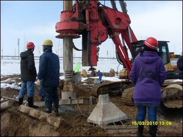 本工程施工工期緊,工序多,且施工經(jīng)歷冬雨季,因此,施工過程中合理的安排各工序施工順序,采用了完善的冬雨季施工方案。在基礎(chǔ)樁施工過程中,解決了地表13m范圍內(nèi)松散回填地層(夾雜卵石、大塊漂石)引起的嚴(yán)重漏漿、塌孔問題,保證了工程順利開展。