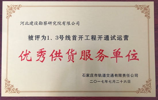 自2013年起,我單位連續4年榮獲石家莊地鐵優秀參建單位,2017年7月,隨著地鐵1、3號線首開工程開通試運營,我單位又榮獲了1、3號線首開工程開通試運營優秀供貨服務單位這一光榮稱號。在接下來的時間里,石家莊地鐵第三方監測項目部仍將再接再厲,充分發揚我單位能打硬仗,敢打硬仗的光榮傳統,在石家莊地鐵建設新的征程中珍惜榮譽,再立新功!