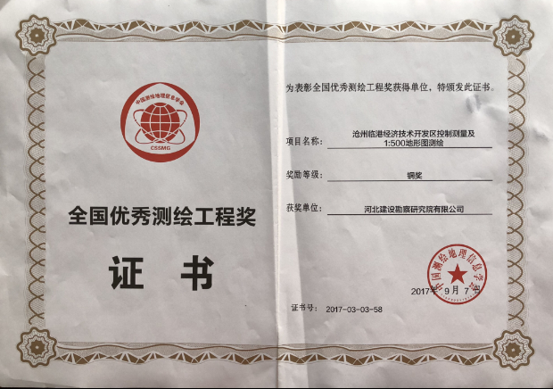 2017年9月7日,由我公司完成的滄州臨港經(jīng)濟(jì)技術(shù)開發(fā)區(qū)控制測量及1:500地形圖測繪項(xiàng)目,被中國測繪地理信息學(xué)會(huì)授予全國優(yōu)秀測繪工程銅獎(jiǎng)。