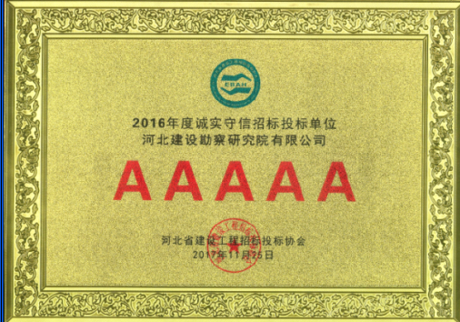 近日,我公司被河北省建設(shè)工程招標(biāo)投標(biāo)協(xié)會(huì)評(píng)為2016年度河北省建設(shè)工程招標(biāo)投標(biāo)誠(chéng)實(shí)守信5A級(jí)施工企業(yè)。