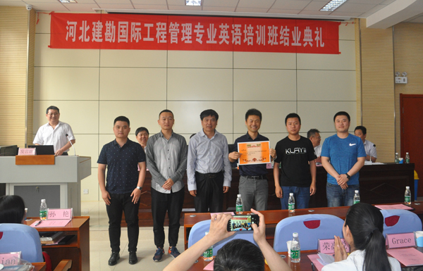 公司委托石家莊鐵道大學繼續教育學院舉辦的首屆國際工程管理專業英語培訓班(共29人,分6組),經過28天的緊張培訓,已經完成全部課程的學習。2018年5月14日下午,石家莊鐵道大學第九實驗室103教室,書聲瑯瑯,掌聲雷鳴,公司首屆國際工程管理專業英語培訓班結業典禮在這里舉行,出席結業典禮的有:公司總經理李華偉、總工程師聶慶科、人力資源部主任張軍旗及全體學員;石家莊鐵道大學副校長陳進杰、繼續教育學院院長王書海、繼續教育學院副院長楊杰、外語系黨支部書記林治華、外語系副主任李玉潔、培訓班班主任孫艷以及教師和助教。