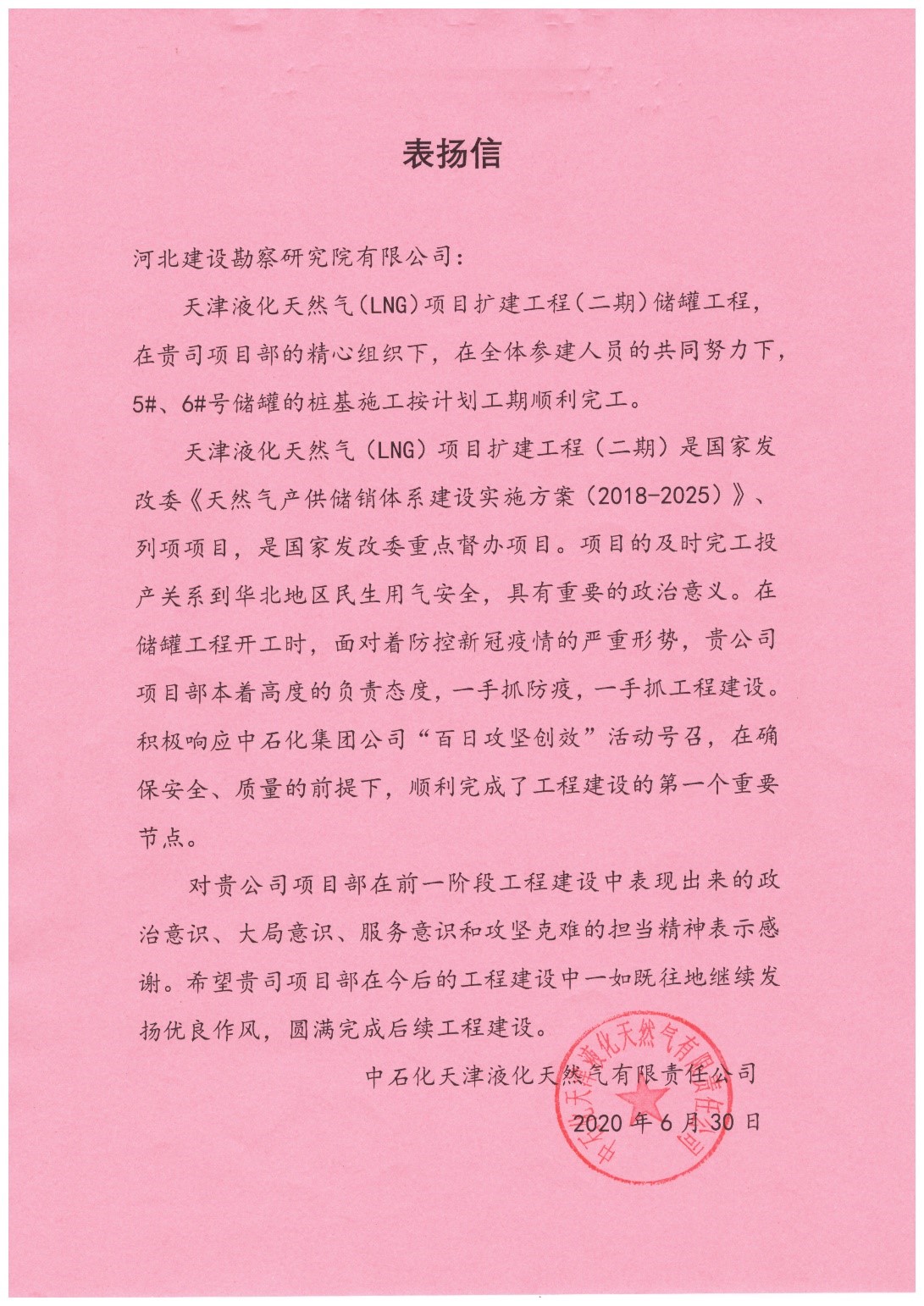 公司承建的天津液化天然氣(LNG)項(xiàng)目擴(kuò)建工程(二期)5#6#罐樁基工程,自2020年4月5日正式開工,歷經(jīng)83個(gè)日夜的奮戰(zhàn),最終于2020年6月26日優(yōu)質(zhì)、高效、圓滿的完成了5#6#罐的樁基施工任務(wù)。中石化天津液化天然氣有限責(zé)任公司,對(duì)我公司中石化天津LNG二期項(xiàng)目部提出表揚(yáng),表揚(yáng)我公司領(lǐng)導(dǎo)及全體項(xiàng)目施工人員對(duì)項(xiàng)目高度負(fù)責(zé)的態(tài)度,一手抓防疫,一手抓工程建設(shè),積極響應(yīng)中石化集團(tuán)公司“百日攻堅(jiān)創(chuàng)效”活動(dòng)號(hào)召,在確保安全、質(zhì)量的前提下,順利完成了工程建設(shè)的第一個(gè)重要節(jié)點(diǎn)。同時(shí)對(duì)我公司在前一階段工程建設(shè)中表現(xiàn)出來的政治意識(shí)、大局意識(shí)、服務(wù)意識(shí)和攻堅(jiān)克難的擔(dān)當(dāng)精神表示感謝。希望我公司在今后的工程建設(shè)中一如既往地繼續(xù)發(fā)揚(yáng)優(yōu)良作風(fēng),圓滿完成后續(xù)工程建設(shè)。