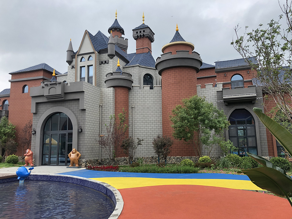 兒童館采用框架結構,地上二層,層高5.2m,建筑面積825.32㎡,建筑總高度12.55m(地面至屋脊高點)。一層設置為展覽、兒童休閑空間,局部二層為兒童游樂空間、兒童閱讀空間及小型演藝舞臺,二層設置有有露天城墻參觀廊,可以俯視園內景色。外立面設計為中世紀歐洲古城堡風格,打造濱水古堡景觀,建筑高度錯落,材質肌理豐富,屋頂色彩鮮艷。使游客仿佛穿越到中世紀童話世界。