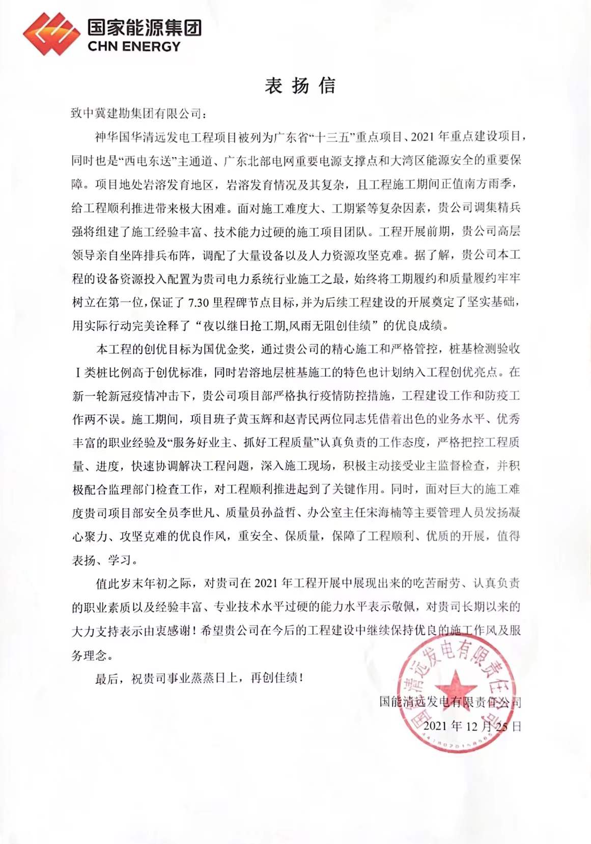 神華國華清遠發電工程項目被列為廣東省“十三五”重點項目、2021年重點建設項目,同時也是“西電東送”主通道、廣東北部電網重要電源支撐點和大灣區能源安全的重要保障。我項目在建設過程中 “夜以繼日搶工期,風雨無阻創佳績”的工作效率得到了高度贊揚。