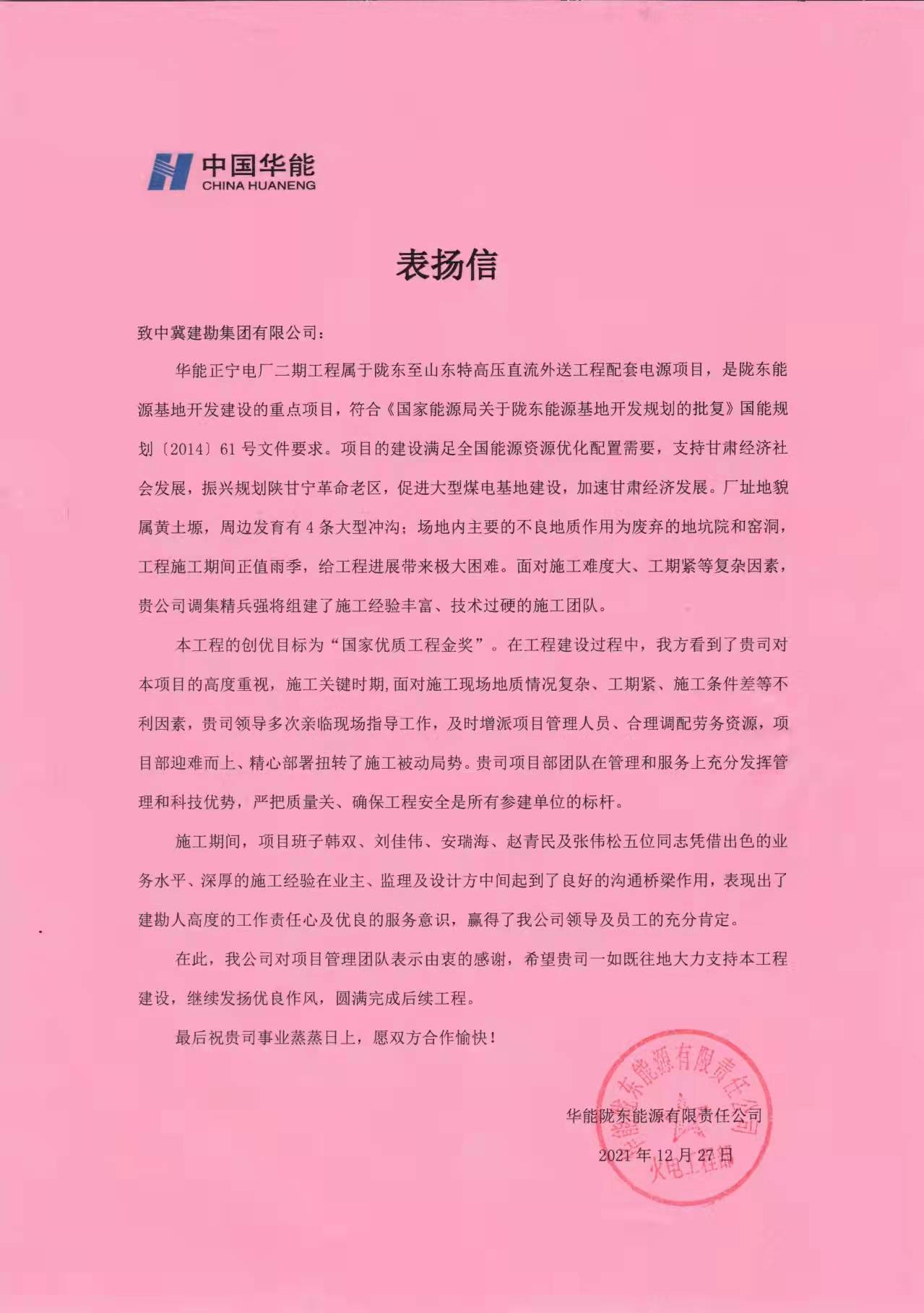 華能正寧電廠二期樁基工程屬于隴東至山東特高壓直流外送工程配套電源項目,是隴東能源基地開發建設的重點項目, 在工程建設過程中面對施工現場地質情況復雜、工期緊、施工條件差等不利因素,項目部迎難而上、精心部署扭轉了施工被動局勢。在管理和服務上充分發揮管理和科技優勢,嚴把質量關、確保工程安全是所有參建單位的標桿。其中項目部班子韓雙、劉佳偉、趙青民、安瑞海及張偉松五位同志憑借出色的業務水平、深厚的施工經驗在業主、監理及設計方中間起到了良好的溝通橋梁作用,表現出了建勘人高度的工作責任心及優良的服務意識,收到業主及監理的高度贊揚。