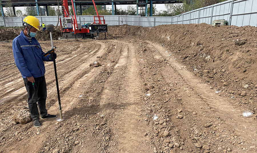 本工程自2022年4月19日開工,2022年6月18日完工,包含CFG樁施工,樁間土開挖及外運,截樁頭,樁基檢測,褥墊層施工和工程降水。其中鑄造車間共有CFG樁約900根,樁徑為500mm,有效樁長為14.5-15.0m,土方開挖及外運約1200m³,樁間土開挖及外運約2500m³,褥墊層鋪設(shè)約680m³;2萬噸聯(lián)合法車間共有CFG樁約3900根,樁徑為500mm,有效樁長為13m,土方開挖及外運約8000m³,樁間土開挖及外運約4400m³,褥墊層鋪設(shè)約2500m³。