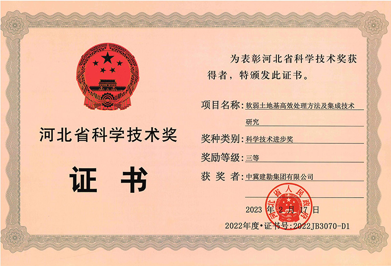 近日,根據《河北省人民政府關于2022年度河北省科學技術獎勵的決定》(冀政字〔2023〕14號),公司申報的《軟弱土地基高效處理方法及集成技術研究》項目,榮獲河北省科技進步三等獎。