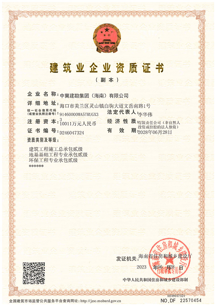 中冀建勘集團(海南)有限公司喜獲建筑業企業貳級資質證書