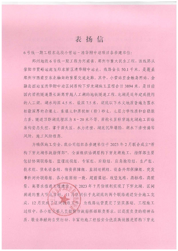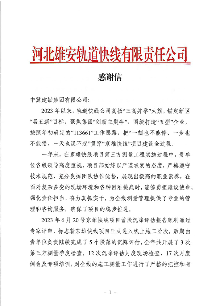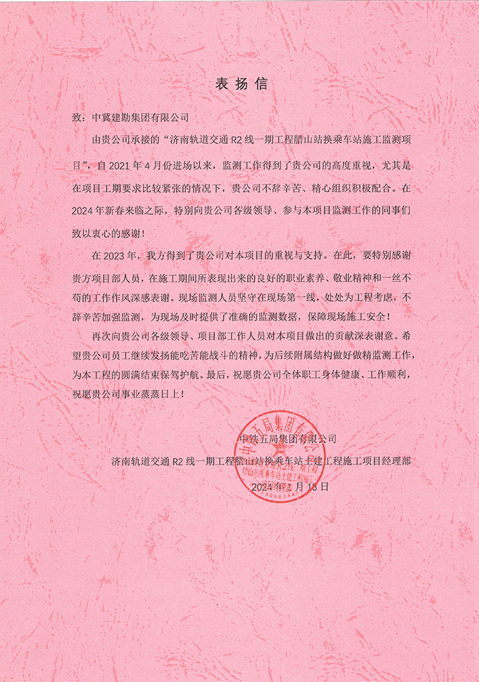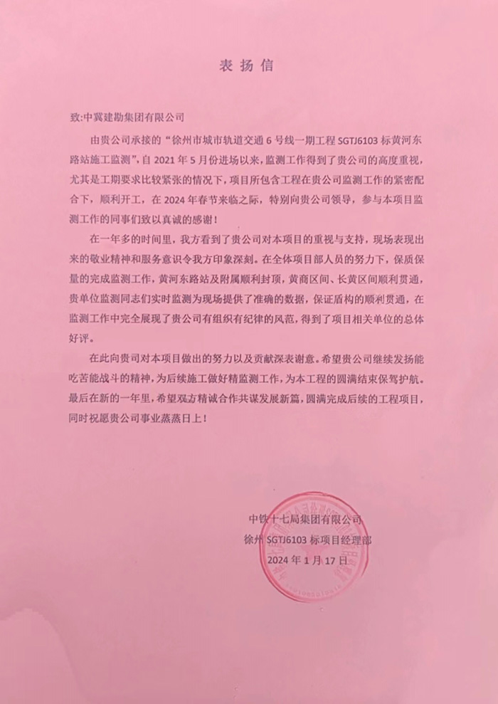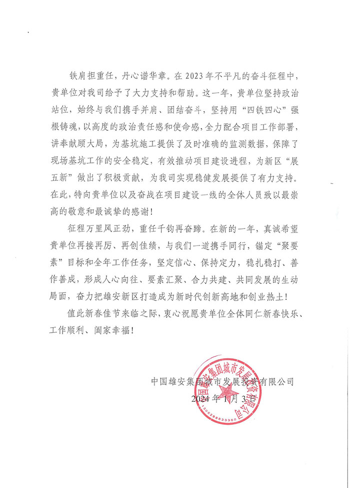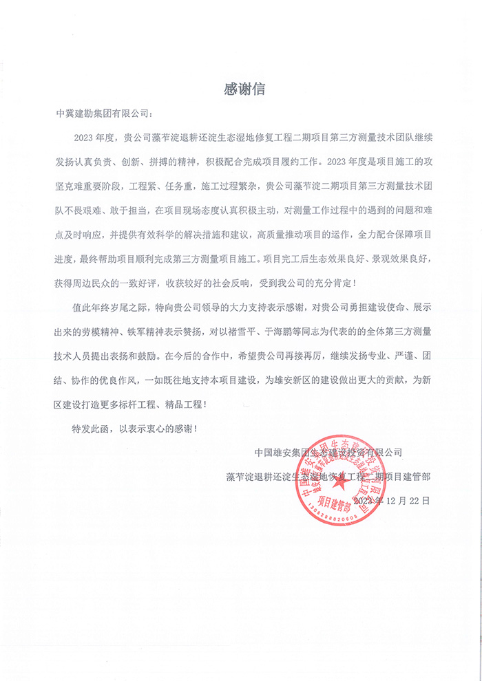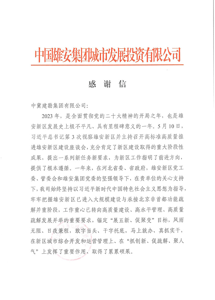 近期,公司陸續收到中國雄安集團城市發展投資有限公司、河北雄安軌道快線有限責任公司、中國雄安集團生態建設投資有限公司、中鐵五局、中鐵十七局、鄭州地鐵集團、內蒙古大唐國際克什克騰旗煤制天然氣電廠、大唐內蒙古多倫電廠等業主單位發來的感謝信。我公司認真負責、敢打能打硬仗的工作態度、頑強拼搏的施工風范和一心為業主服務的理念,贏得了業主的高度認可和贊揚,特發來感謝信深表感謝!