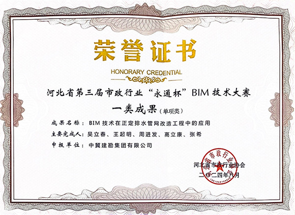 近日,河北省市政行業(yè)協(xié)會發(fā)文《關(guān)于公布河北省第三屆市政行業(yè)“永通杯”BIM技術(shù)大賽結(jié)果的通知》(冀市協(xié)〔2024〕21號),我公司參賽項目“BIM 技術(shù)在正定排水管網(wǎng)改造工程中的應(yīng)用”項目榮獲一類成果。