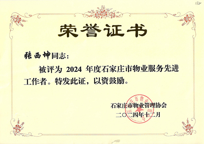 中冀建勘物業(yè)服務(wù)有限公司榮獲“2024年度石家莊市物業(yè)管理先進單位”,張西坤同志榮獲“物業(yè)服務(wù)先進工作者” 榮譽稱號。